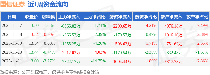 证券之星音讯,到2025年11月21日收盘,国信证券(002736)报收于13.0元,较上星期的13.73元跌落5.32%。本周,国信证券11月20日盘中最高价报13.83元。11月21日盘中最贱价报13.0元。国信证券当时最新总市值1331.43亿元,在证券板块市值排名10/50,在两市A股市值排名118/5167。