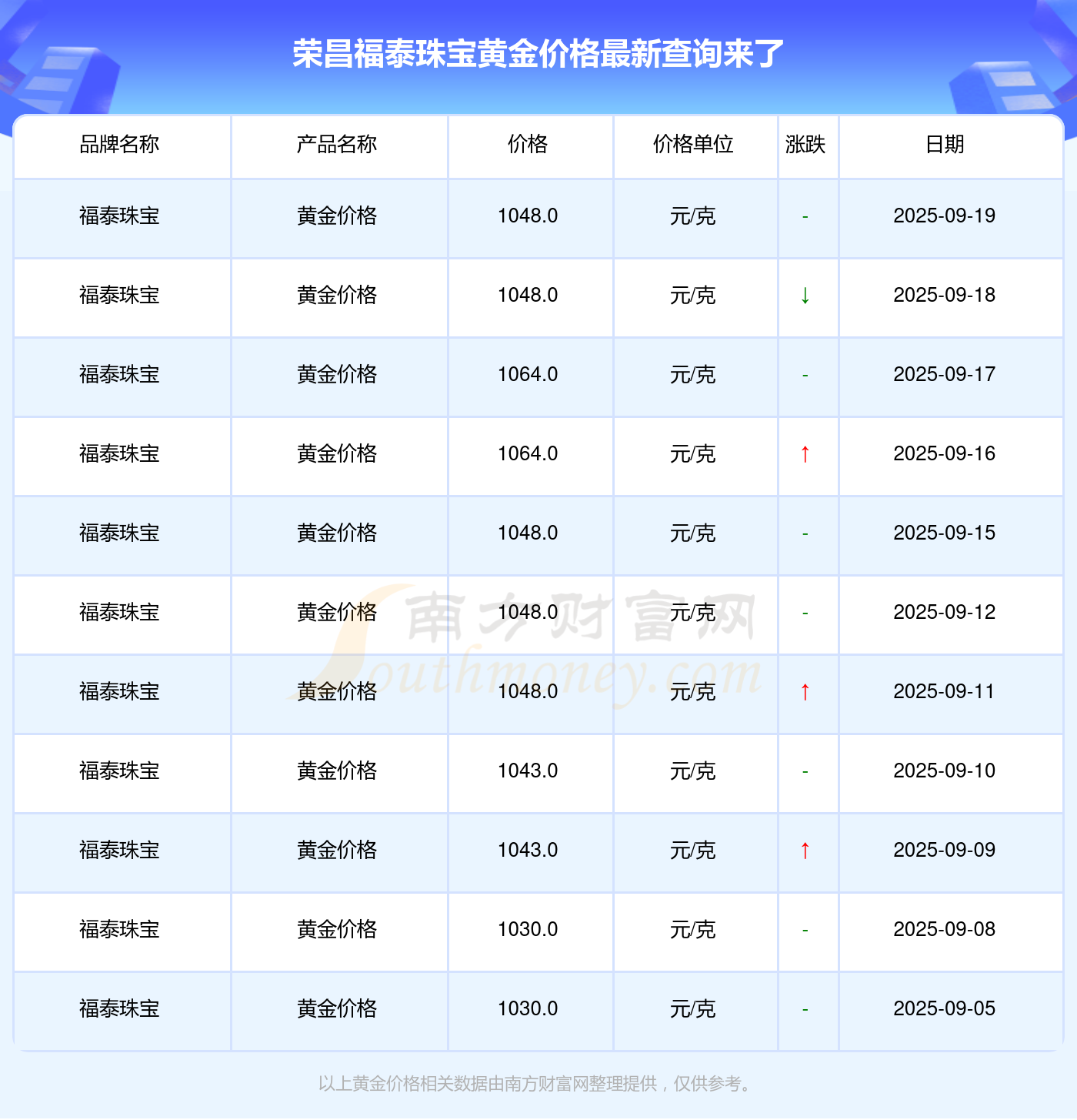 今天荣昌福泰珠宝金价发布今天每克黄金在零售商场的价格是多少今天(2025年9月20日),荣昌福泰珠宝金价的定价为 1048.0元/克。